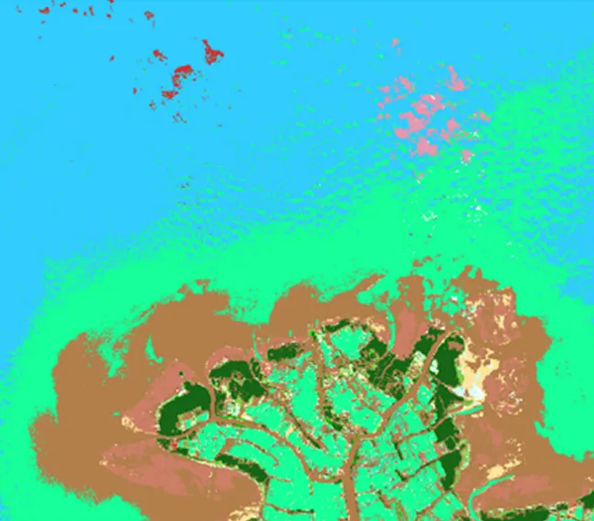 True colour image (left) and classification from Lavender et al. (2022) methodology at the Solo River Mouth (Indonesia). Plastic is found offshore (red pixels).